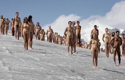 Voluntarios desnundos posan en el glaciar más grande de los Alpes, el Altsch, en Suiza.